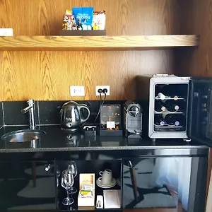 Guests are offered a coffeemaker and glassware in the rooms.